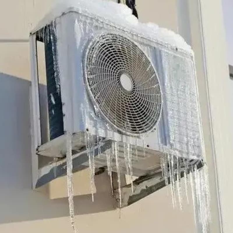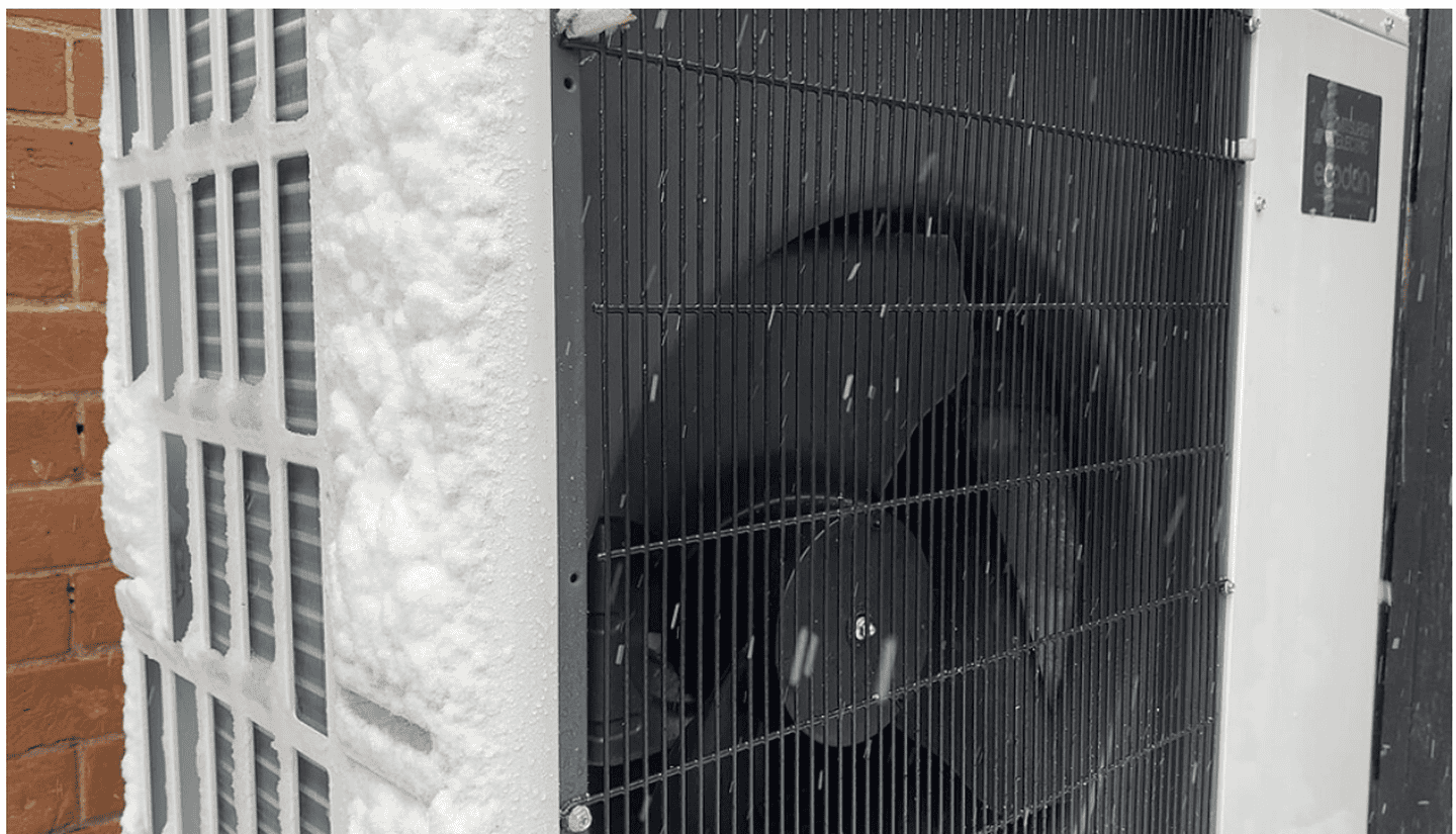 Зовнішній блок теплового насоса, вкритий інеєм і снігом під час роботи в мороз. Заводські моделі мають автоматичний дефрост, що періодично відтаює лід. В саморобних установках без такої автоматики лід наростає, блокуючи роботу вентилятора і теплообмінника.