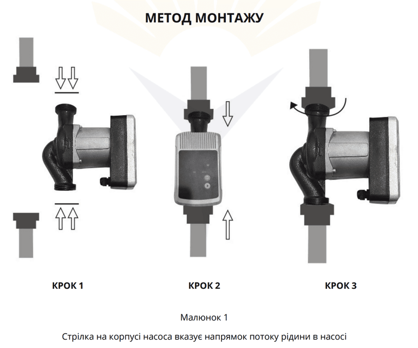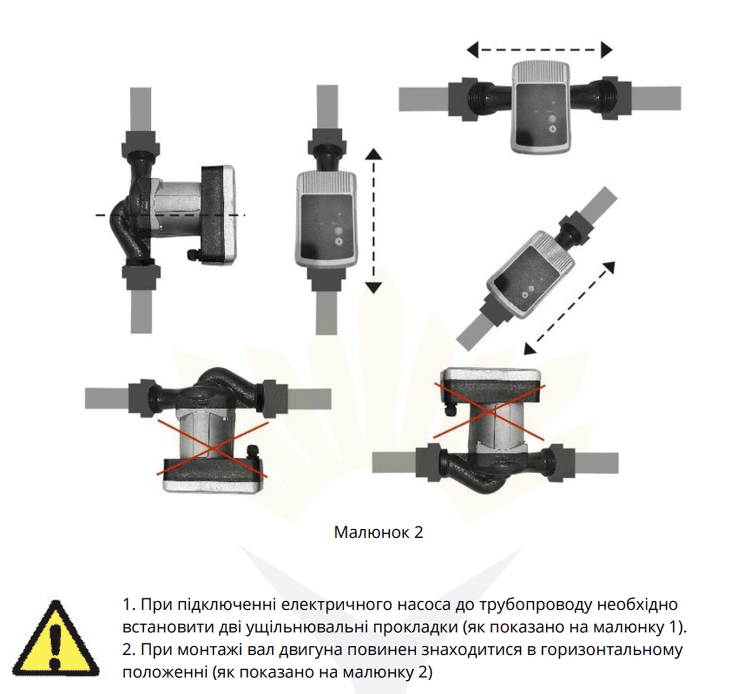 Монтаж насоса слід здійснювати в сухому та добре провітрюваному приміщенні, щоб уникнути впливу вологи та потрапляння води, що може спричинити коротке замикання. Місце встановлення повинно бути доступним для проведення обслуговування або заміни пристрою.