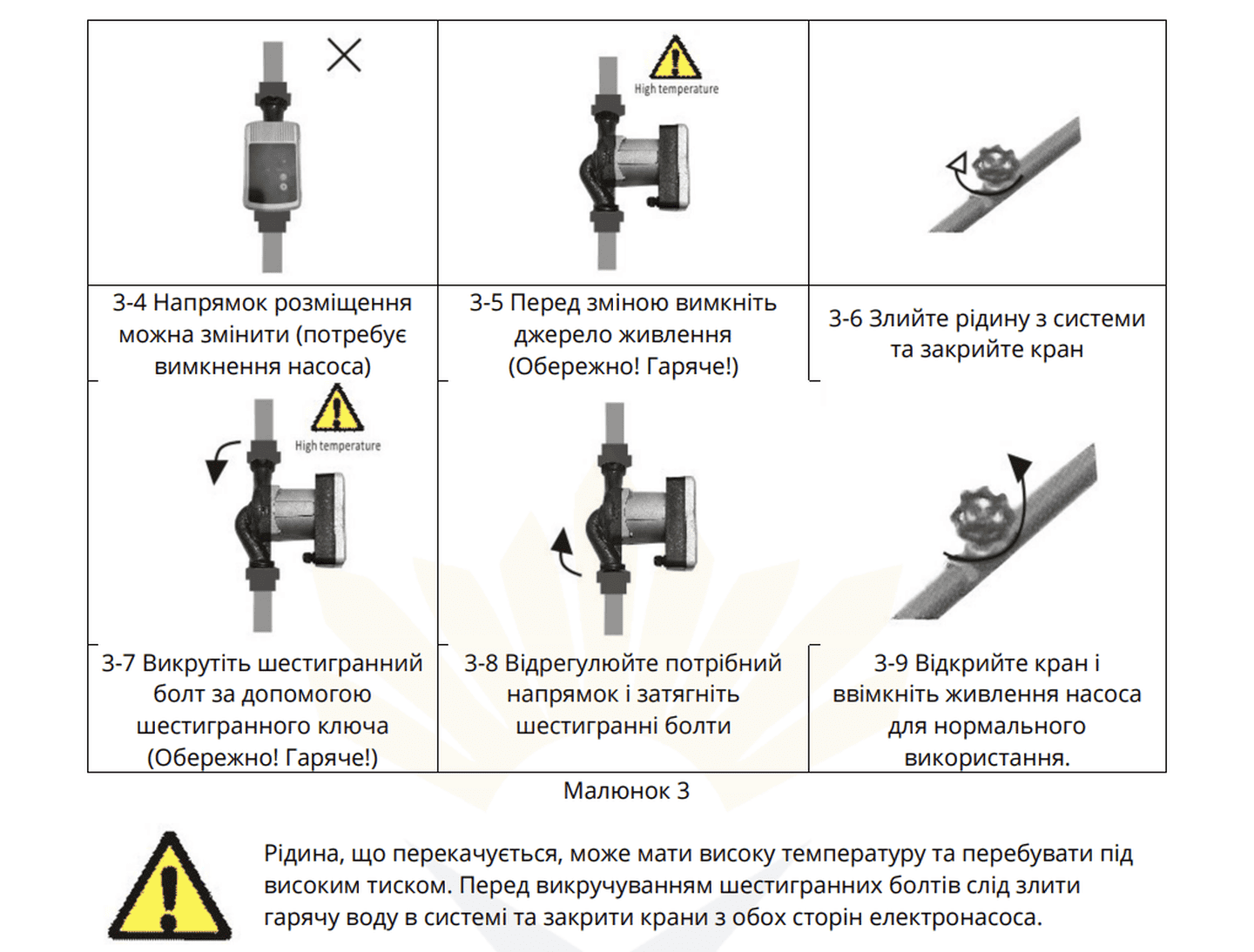 У місці встановлення насоса слід передбачити попереджувальні знаки безпеки, щоб уникнути випадкових аварійних ситуацій.
