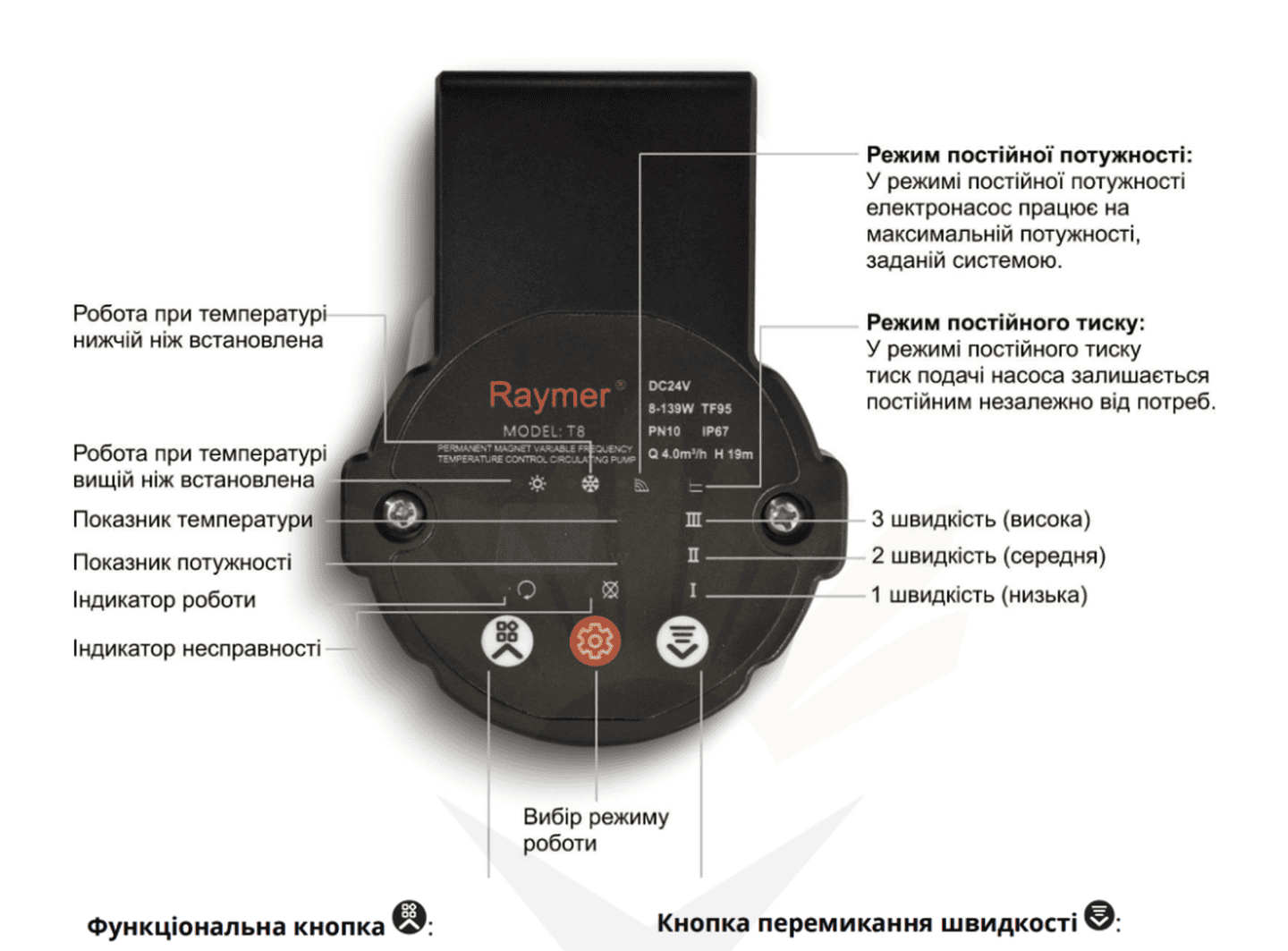 Режим постійної потужності: В цьому режимі насос працює на максимально допустимій потужності, заданій системою. Режим використовується у випадках, коли потрібно забезпечити максимальний рівень циркуляції для підтримки обігріву або водопостачання.