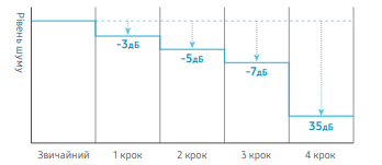 4 ступені регулювання. Функція надає чотири різні ступені регулювання рівня шуму. Користувач може обирати між цими ступенями залежно від поточних умов, наприклад, увечері, коли необхідно забезпечити тишу, або вдень, коли вищий рівень шуму не такий критичний. Він не заважає вам або вашим сусідам. Просто виберіть один із чотирьох кроків, щоб