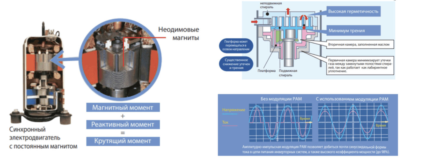 Спіральні компресори з FCM (Frame Compliance Mechanism): Механізм FCM підтискає рухому спіраль компресора до нерухомої, що знижує втрати, пов’язані з перетіканням газу, і збільшує ефективність.