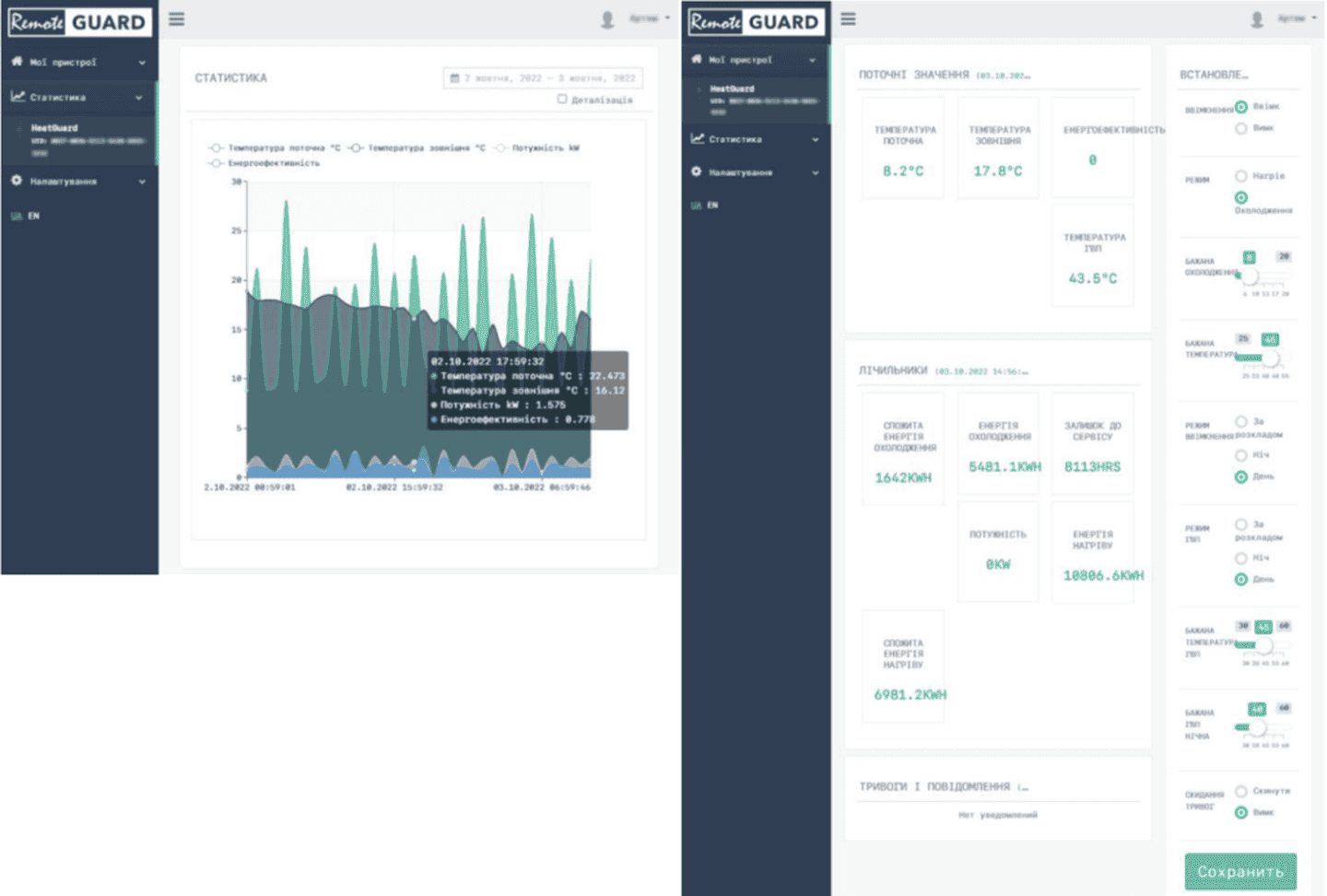 - Моніторинг роботи: Безперервний моніторинг роботи теплового насоса: продуктивність, споживана потужність, коефіцієнт продуктивності СОР, витрата теплоносія, а також вбудовані теплові, витратні та електричні лічильники – дають змогу користувачеві контролювати роботу системи й оптимізувати її роботу для досягнення максимальної ефективності.