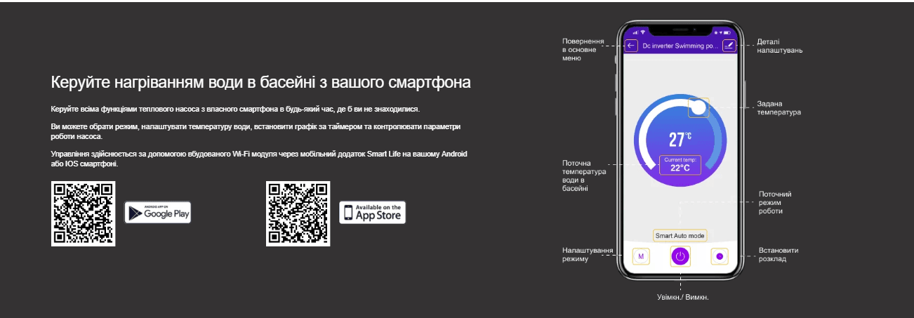 Вбудований контролер дозволяє вибирати режими роботи насоса, включаючи обігрів, охолодження або автоматичне підтримування заданої температури води. Крім того, за допомогою Wi-Fi модуля та додатка Smart Life ви можете керувати насосом з вашого смартфона в будь-який час та з будь-якого місця.