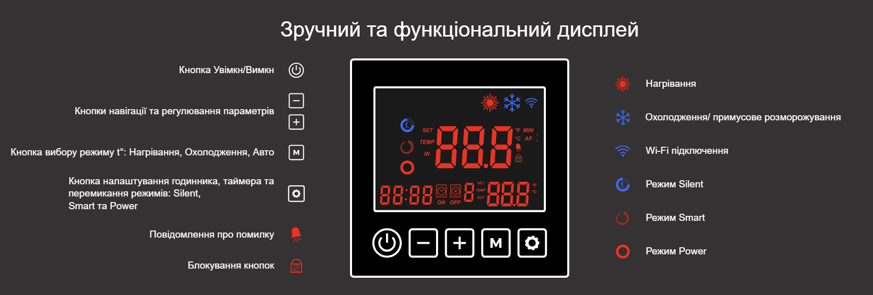 • Режим  роботи «Silent» теплового насоса полягає в спеціальному режимі, при якому насос працює з мінімальним рівнем шуму. У цьому режимі насос працює менш шумно, ніж у звичайному режимі, що особливо важливо в ситуаціях, коли потрібно мінімізувати шум, наприклад, вночі або в неподалік від житлових приміщень. Тихий режим забезпечує комфортне використання теплового насоса, не створюючи зайвого шуму, що особливо цінно в умовах житлових зон або офісних приміщень.