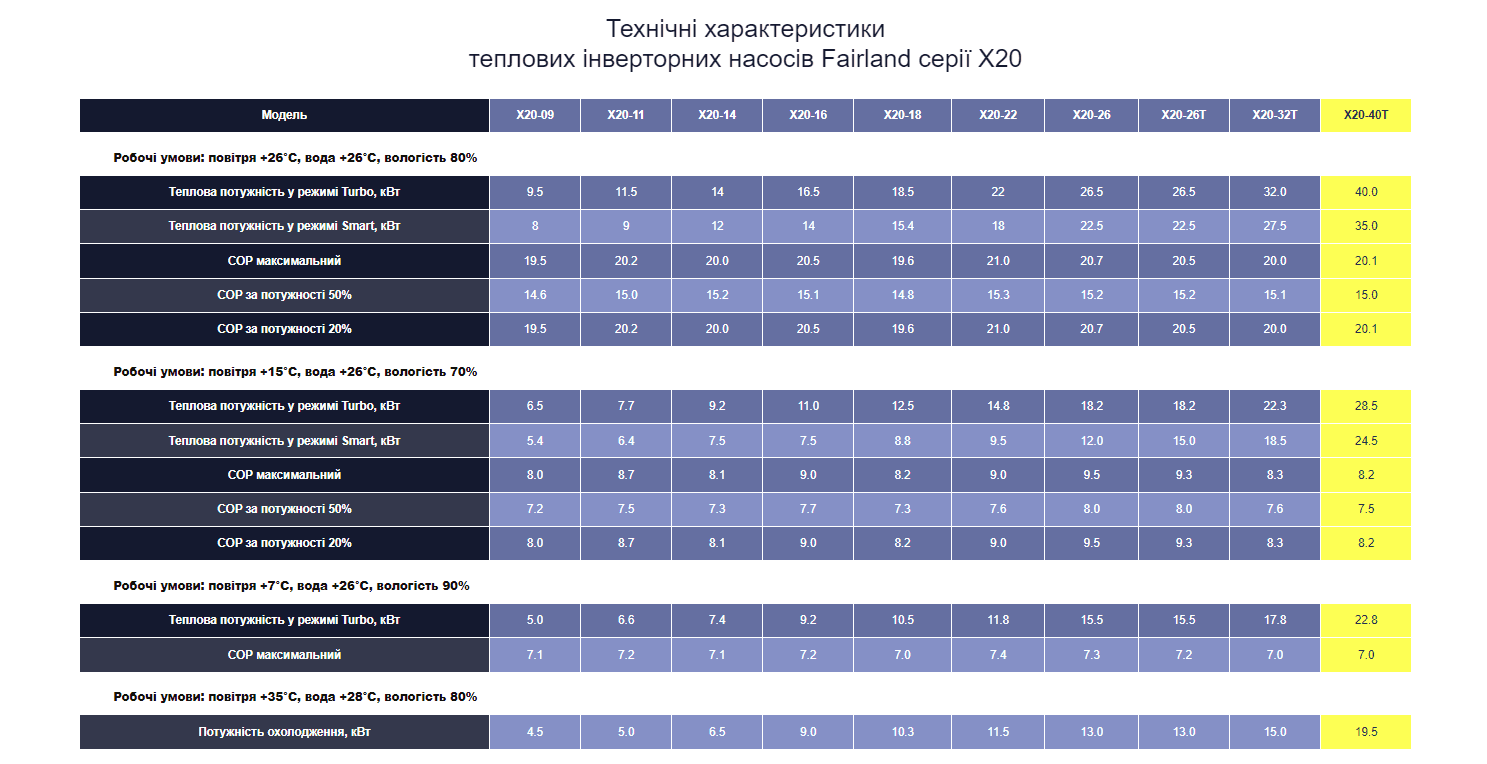 Fairland X20-40T — це тепловий інверторний насос, який встановлює нові стандарти в галузі нагрівання та охолодження води в басейнах. Він являє собою ідеальне рішення для басейнів об’ємом до 160 м³, забезпечуючи оптимальну температуру води в будь-який час року. Інверторна технологія та високоефективний компресор Mitsubishi  забезпечують високу ефективність на 50-70% вищу, ніж у стандартних інверторних системах. Завдяки вбудованій системі управління, насос легко налаштовується і контролюється в трьох різних режимах роботи: Turbo, Smart і Silence.