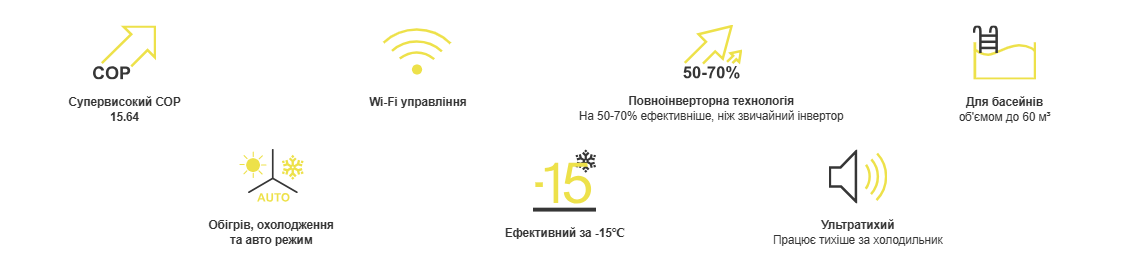 Працює з максимальним коефіцієнтом продуктивності: COP 15,25, що забезпечує ефективність та економію енергії під час обігріву або охолодження води у басейні.