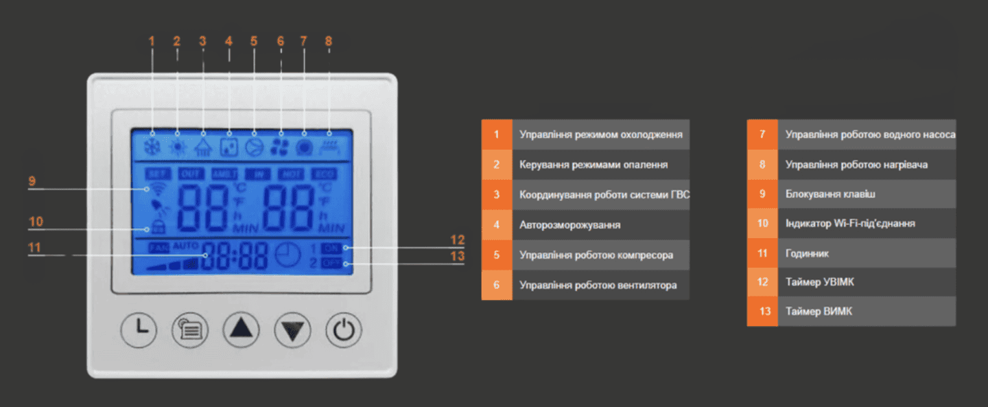 1. Режим нагріву: Температура може бути налаштована до +60°C, що забезпечує ефективне опалення приміщення, навіть за мінусових зовнішніх температур.