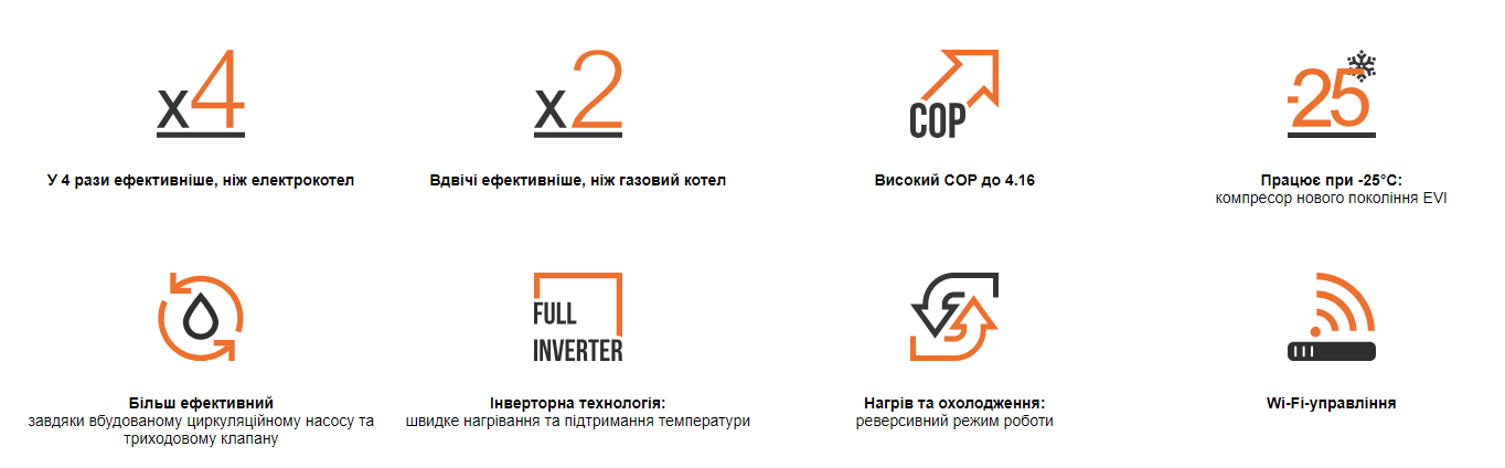 • Енергоефективність COP: до 4.1 (отримання 4.1 кВт тепла на кожен витрачений кВт електрики)
