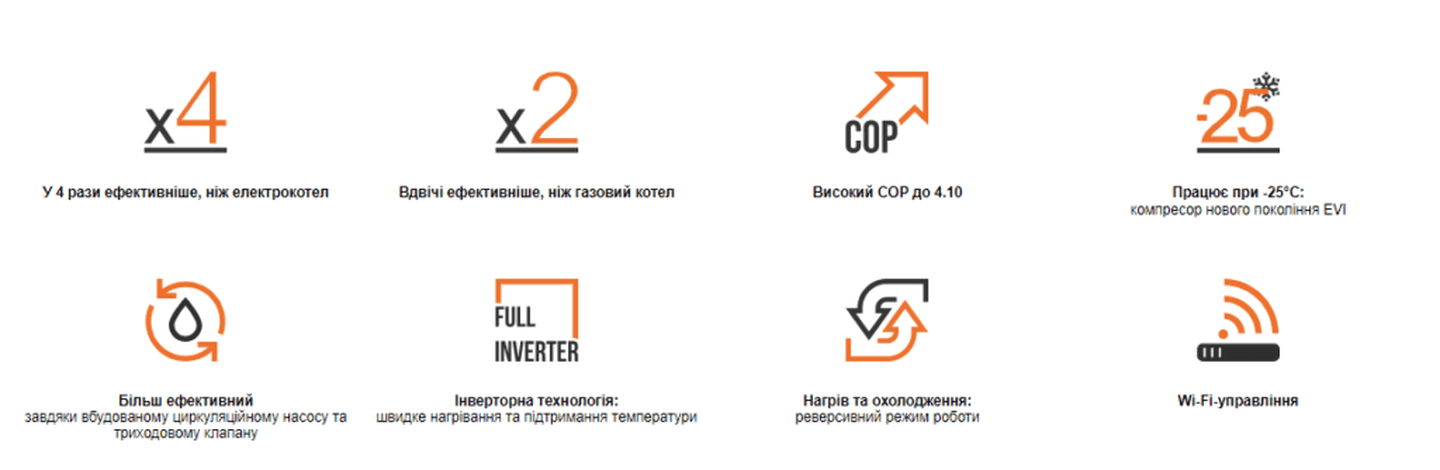 • Енергоефективність COP: до 4.1 (отримання 4.1 кВт тепла на кожен витрачений кВт електрики)