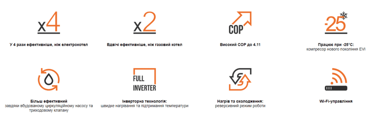 • Енергоефективність COP: до 4.11 (отримання 4.11 кВт тепла на кожен витрачений кВт електрики)