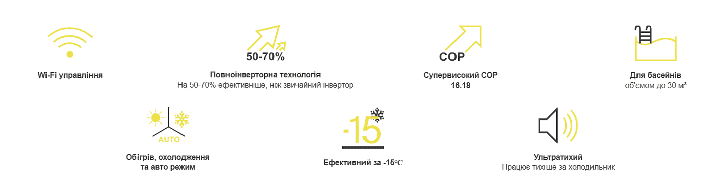 Працює з максимальним коефіцієнтом продуктивності: COP 16.18, що забезпечує ефективність та економію енергії під час обігріву або охолодження води у басейні.