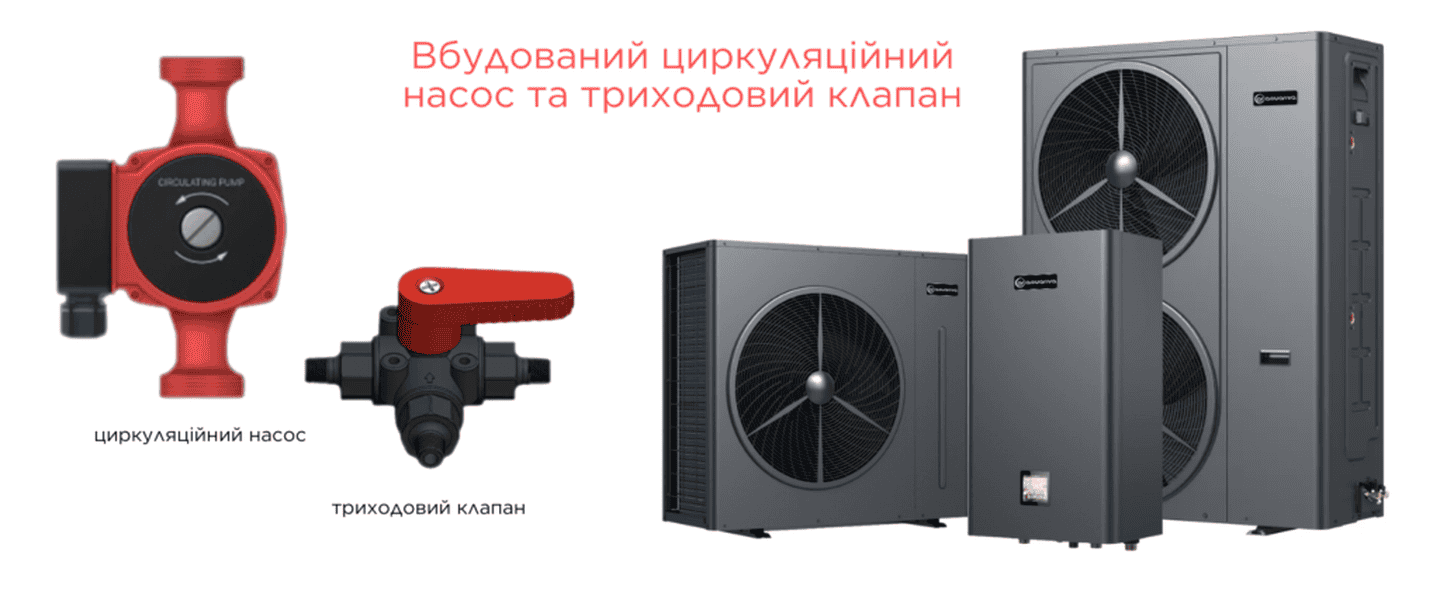 Тепловий насос Aquaviva Plus оснащений вбудованим циркуляційним насосом та триходовим клапаном. Циркуляційний насос забезпечує постійний рух теплоносія у системі, підтримуючи рівномірний розподіл тепла по всіх приміщеннях та запобігаючи перегріву або переохолодженню системи. Це також підвищує енергоефективність роботи насоса.