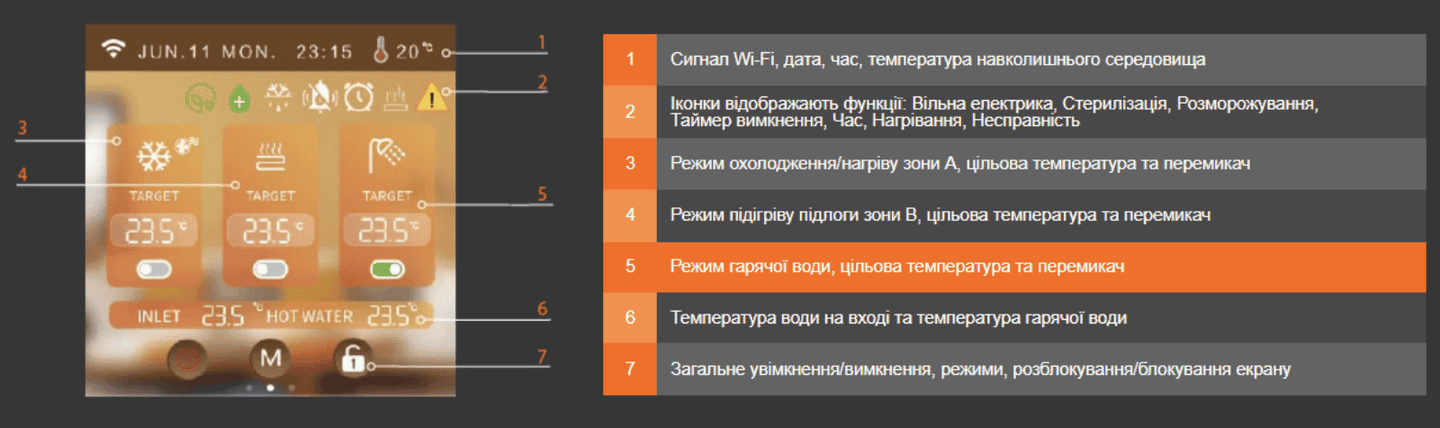 - Автоматичний режим + гаряче водопостачання: Автоматично забезпечує опалення або охолодження та водночас надає гарячу воду.