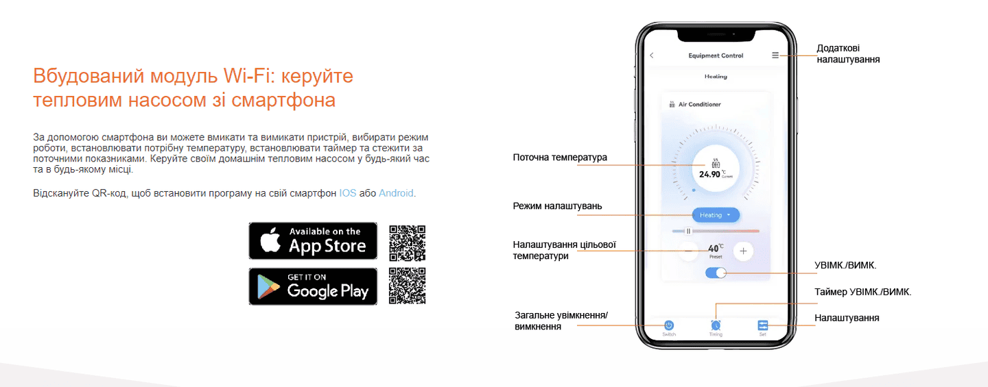 - Режим нагріву: Буферна ємність насоса нагрівається до +60°C, що забезпечує ефективне опалення приміщень навіть у найхолодніші дні.