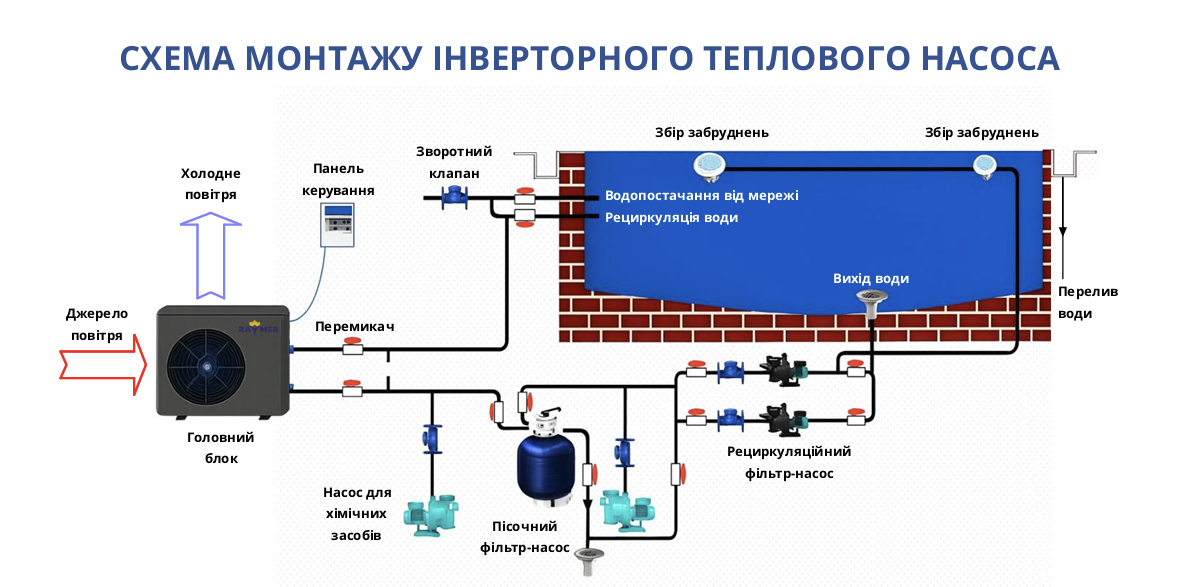 Тепловий насос працює за принципом рециркуляції: вода постійно циркулює через фільтр, нагрівається і повертається в басейн, підтримуючи задану температуру.