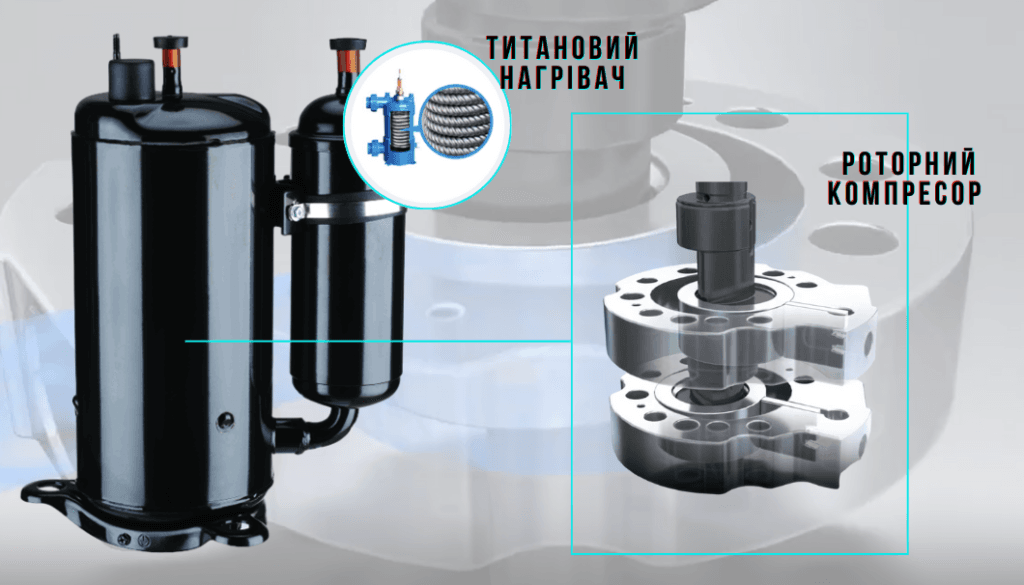 Титановий теплообмінник забезпечує ефективний теплообмін між різними середовищами завдяки своїй конструкції, де тепло передається через титанову поверхню. Титан характеризується високою стійкістю до корозії та окислення, що робить його ідеальним матеріалом для використання в системах, де вода контактує з обладнанням, наприклад, у басейнах. Таким чином, титановий теплообмінник забезпечує надійну і довговічну роботу теплового насоса, мінімізуючи ризик корозії або пошкодження від хлорованої або морської води.