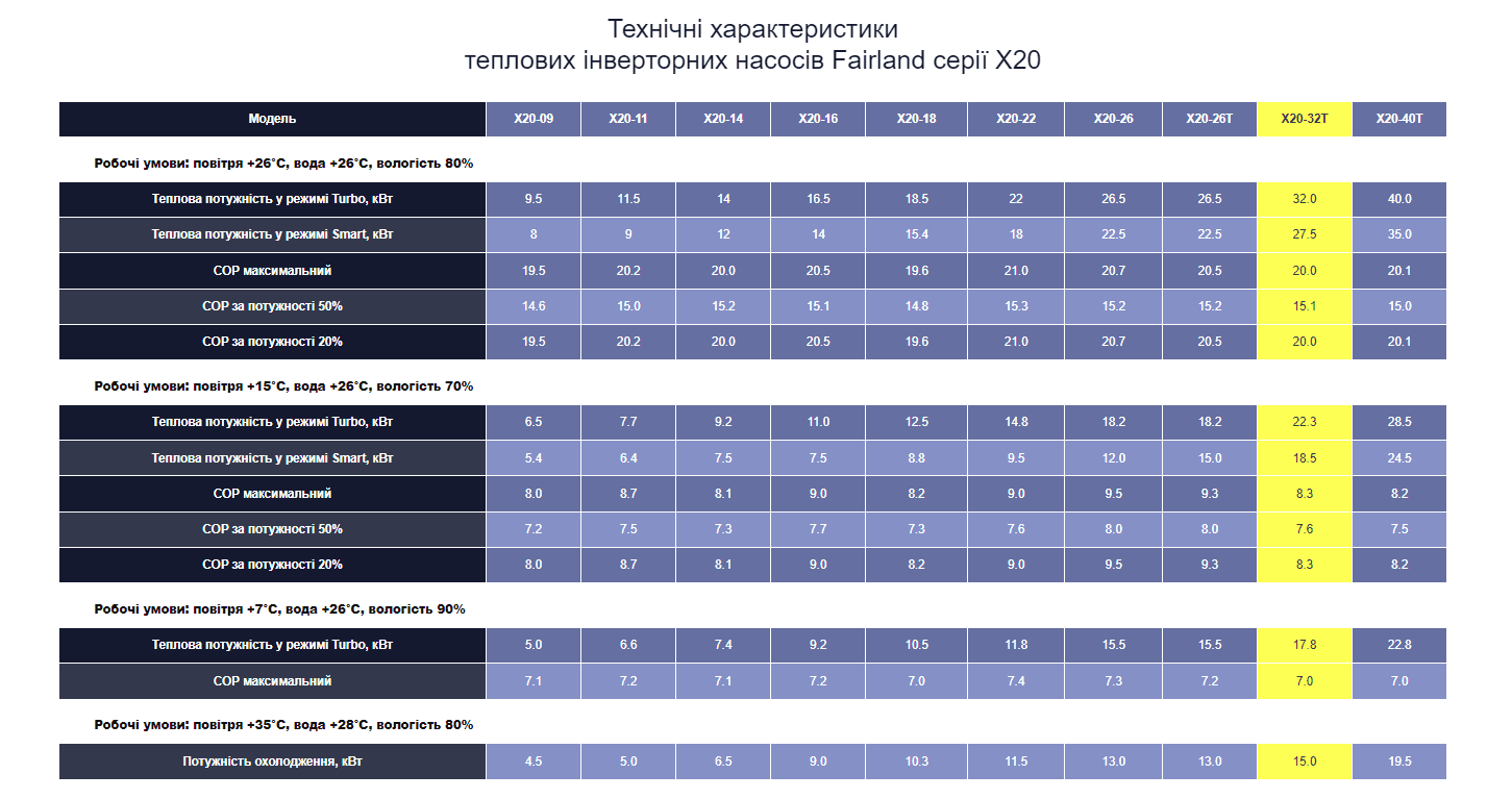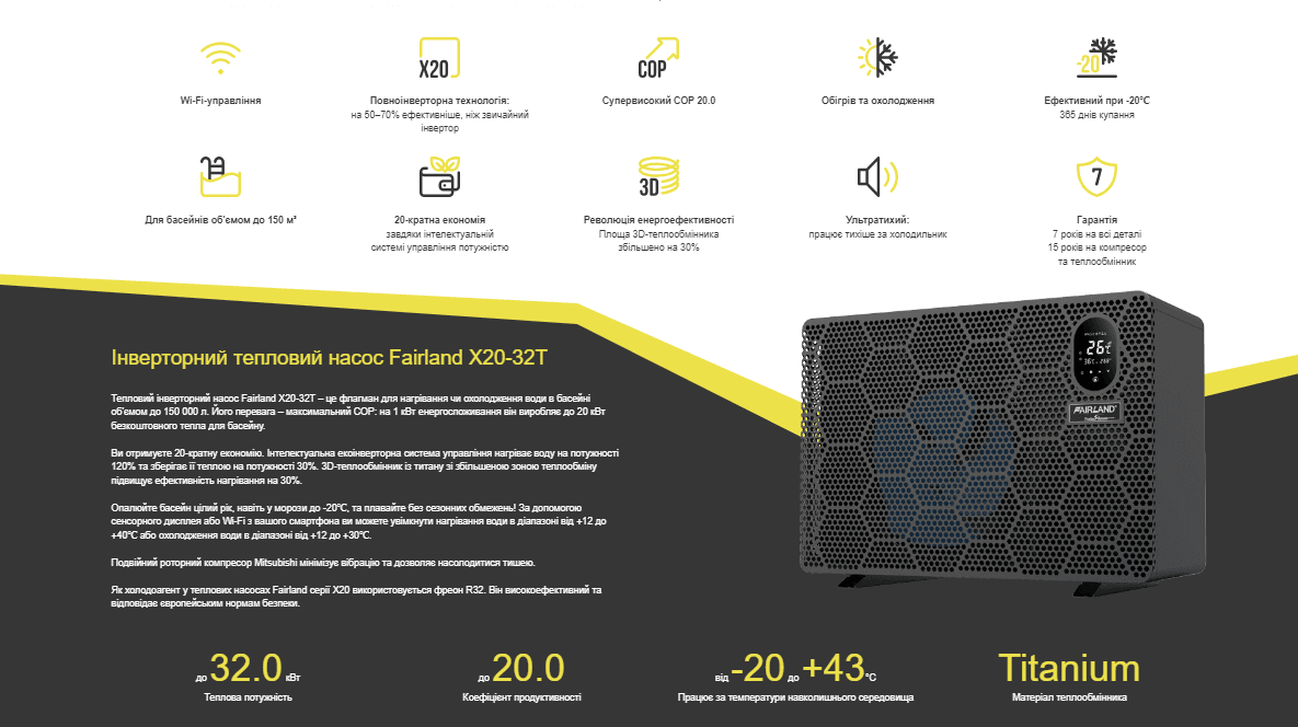 Fairland X20-32T — це тепловий інверторний насос, який встановлює нові стандарти в галузі нагрівання та охолодження води в басейнах. Він являє собою ідеальне рішення для басейнів об’ємом до 150 м³, забезпечуючи оптимальну температуру води в будь-який час року. Інверторна технологія та високоефективний компресор Mitsubishi  забезпечують високу ефективність на 50-70% вищу, ніж у стандартних інверторних системах. Завдяки вбудованій системі управління, насос легко налаштовується і контролюється в трьох різних режимах роботи: Turbo, Smart і Silence.