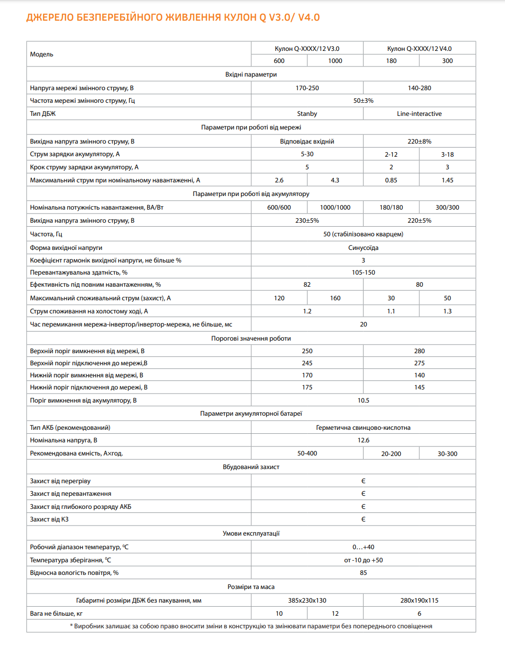Порівняння характеристик ДБЖ серії Елекс Кулон Q: