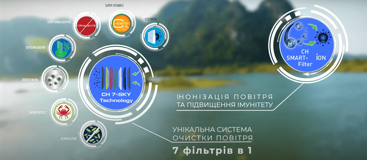 • CH 7-SKY Technology — багатоступенева система очищення повітря на основі 7 фільтрів, які затримують широкий спектр забруднень, включно з пилом, алергенами та запахами.