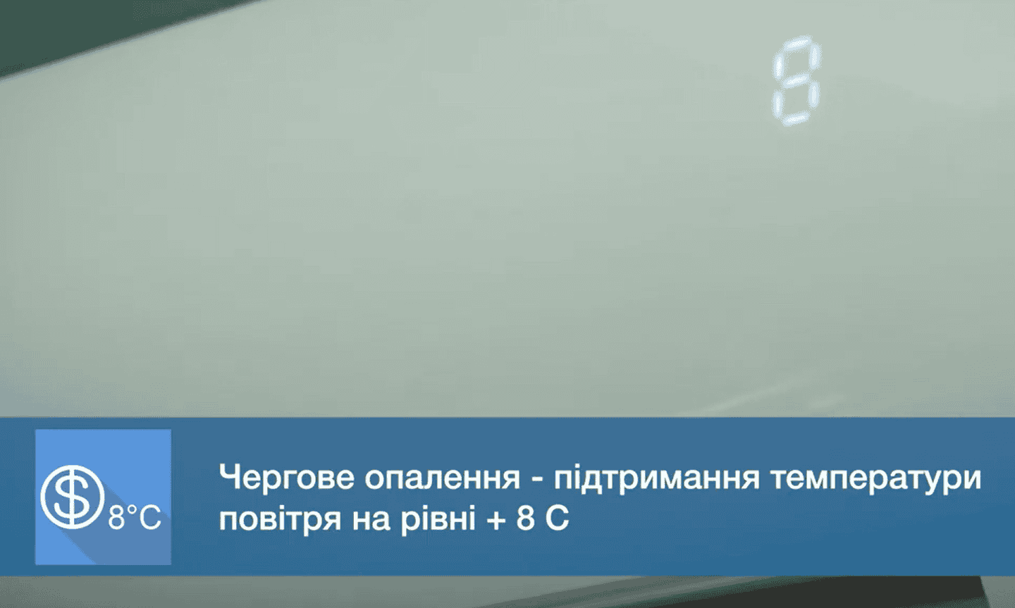 • Функція +8°C — запобігає замерзанню приміщення у разі тривалої відсутності, підтримуючи базову температуру з мінімальним енергоспоживанням.