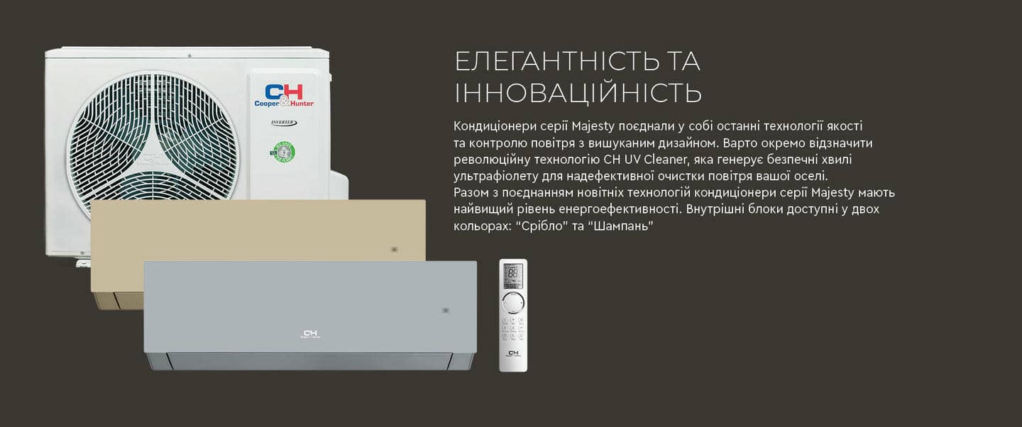 Cooper&Hunter Majesty  – це інноваційний кондиціонер преміумкласу, який поєднує в собі передові технології, високу енергоефективність та стильний дизайн. Завдяки інверторній системі, технології ультрафіолетового очищення повітря, функції самоочищення та іонізації, пристрій забезпечує комфортний мікроклімат і чистоту повітря в приміщенні.