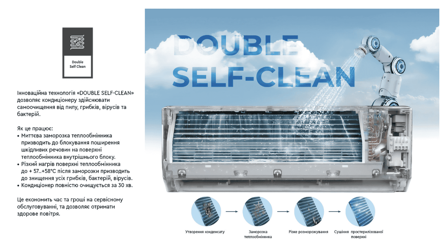 Ця функція забезпечує автоматичну самоочистку внутрішнього блоку кондиціонера. Спочатку відбувається заморожування теплообмінника, що запобігає поширенню грибків і бактерій, а потім різке нагрівання до +58°C, яке знищує всі шкідливі мікроорганізми. Це гарантує довговічну роботу пристрою та зменшує необхідність у сервісному обслуговуванні.