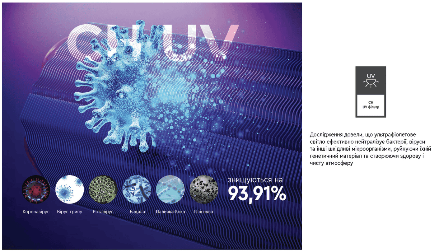 Система ультрафіолетового очищення повітря ефективно знищує бактерії, віруси та інші мікроорганізми. Ультрафіолетове випромінювання руйнує структуру шкідливих частинок, гарантуючи чисте, безпечне та здорове повітря у приміщенні.