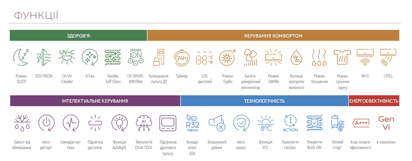 Технологія ECO Fresh/ Технологія CH Smart Ion/ Функція самоосушення/ Технологія CH-UV/ Функція самоочищення/ Авторестарт/ Автозахист