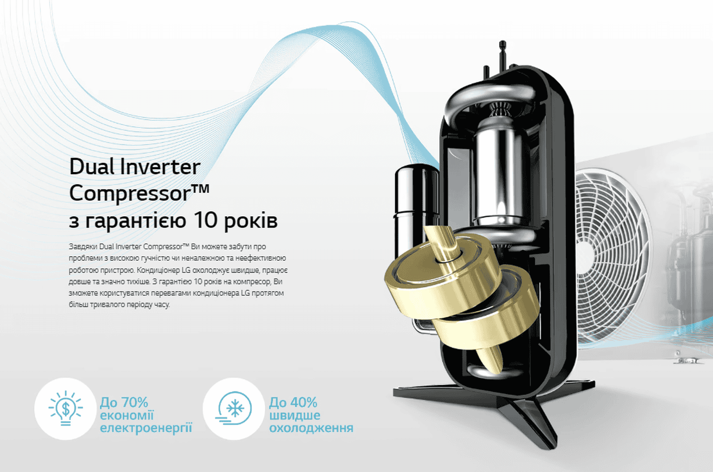 DUAL Inverter Compressor — це одна з ключових інноваційних технологій LG, що забезпечує ефективність, економію енергії та довговічність у роботі кондиціонерів.