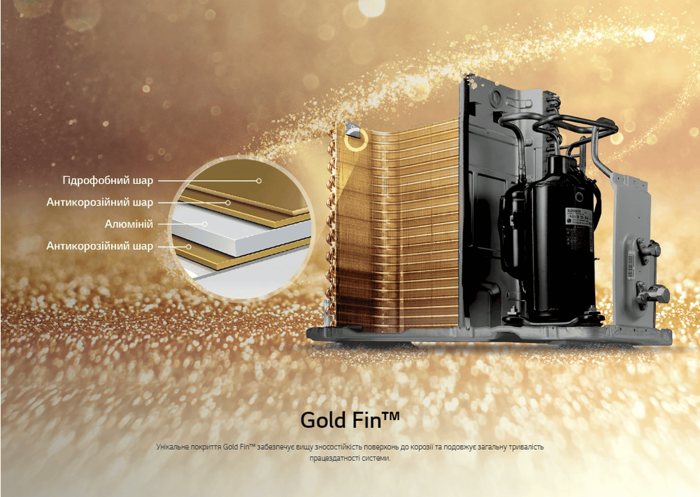 Технологія Gold Fin від LG — це інноваційне антикорозійне покриття, яке застосовується на теплообмінниках кондиціонерів. Основна мета цього покриття полягає в забезпеченні тривалої та надійної роботи кондиціонера, захищаючи його від корозії, яка може виникнути внаслідок впливу агресивних зовнішніх умов.