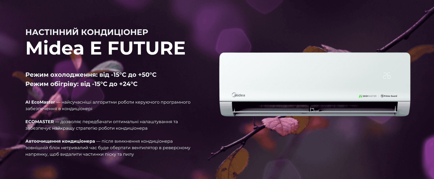 Midea E FUTURE — це передовий кондиціонер, який об’єднує штучний інтелект, високоякісні матеріали, сучасні інверторні технології та зручні функції для максимального комфорту і ефективності.