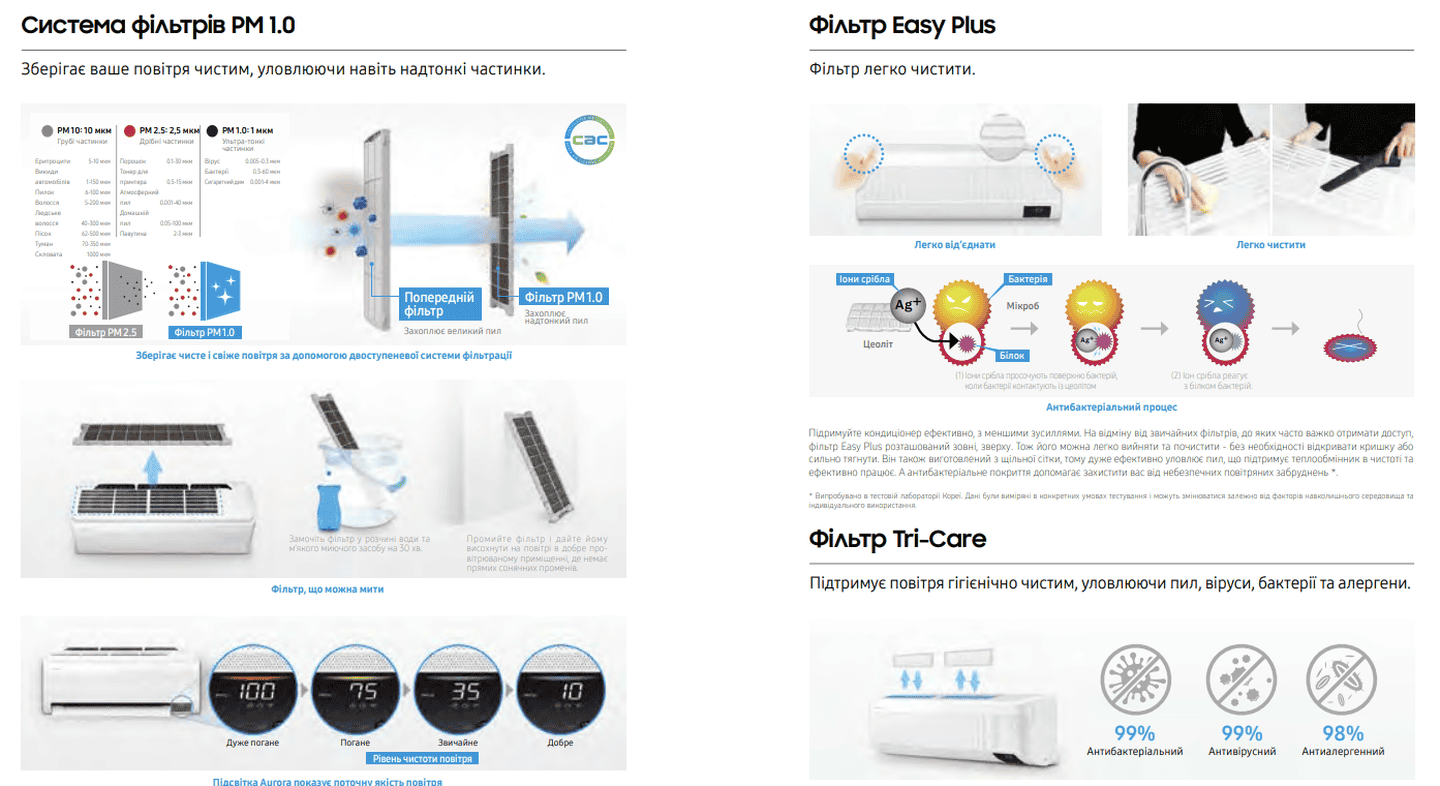 Фільтр Easy Filter Plus має антибактеріальне покриття і легко очищується. Кондиціонер оснащений фільтром, розташованим на верхній панелі, який легко вийняти, почистити та встановити назад. Антибактеріальне покриття фільтруючого елемента видаляє з повітря небезпечні забруднення та алергени, забезпечуючи чистоту повітря.