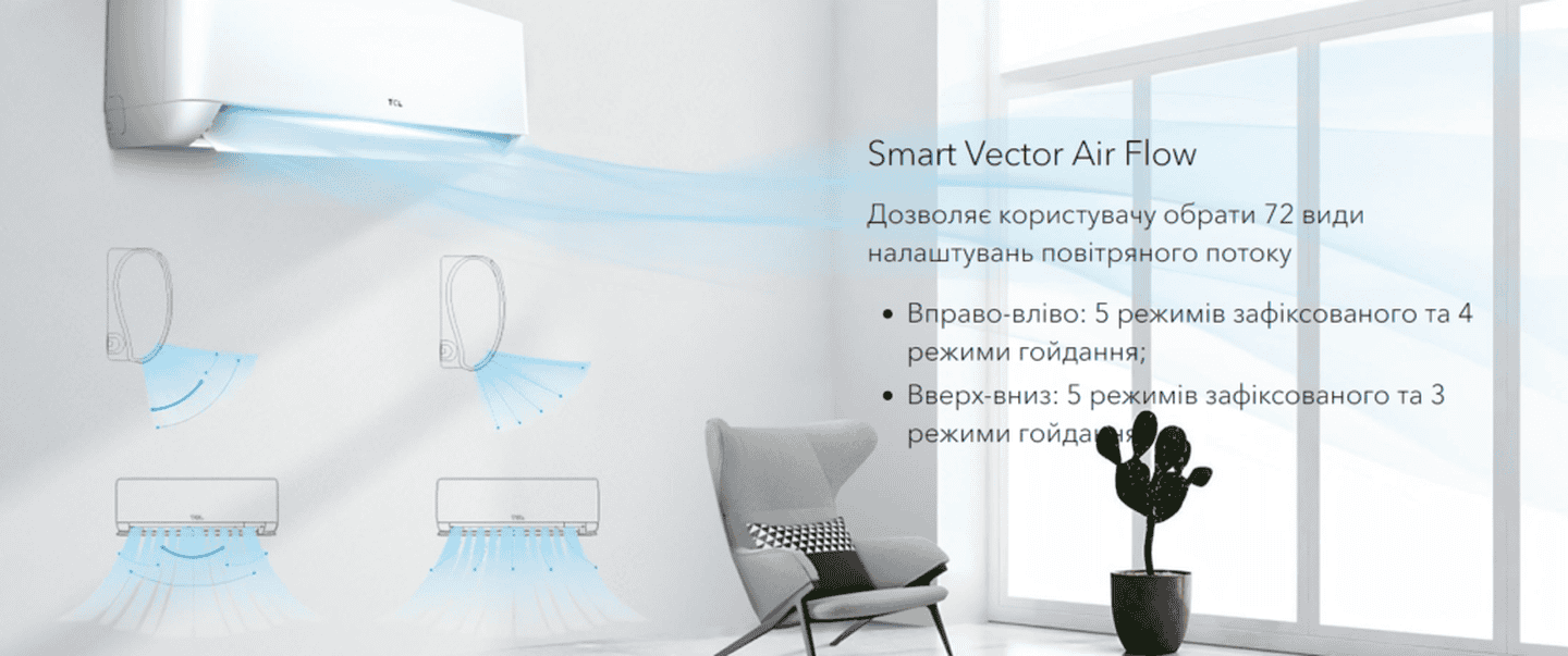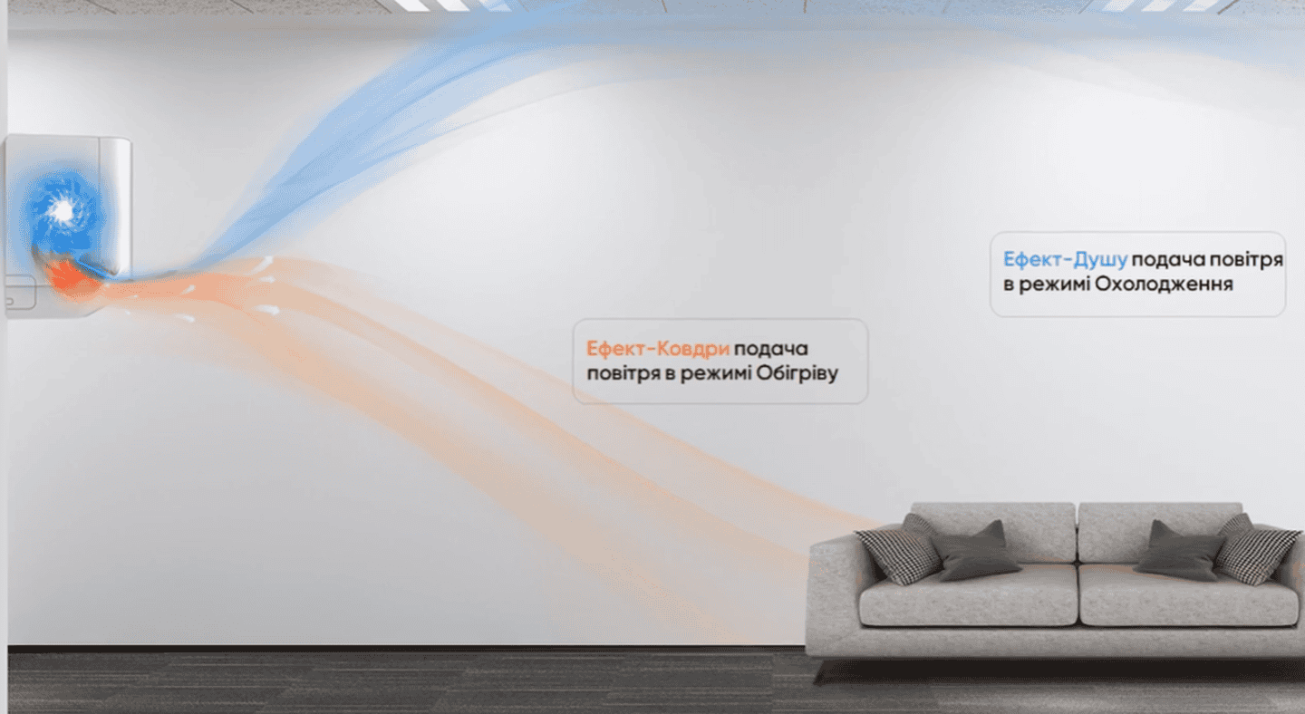 Розумний потік повітря забезпечує оптимальне розподілення повітря залежно від обраного режиму. У режимі охолодження прохолодне повітря спрямовується вгору, уникаючи прямого потоку до голови користувача. Це дозволяє запобігти неприємним відчуттям від сильного охолодження. У режимі обігріву повітря спрямовується вниз, на ноги, що створює приємний і комфортний обігрів приміщення. Такий підхід забезпечує більш природне розподілення тепла або холоду в приміщенні, що сприяє рівномірному температурному балансу та комфорту без зайвого енергоспоживання.