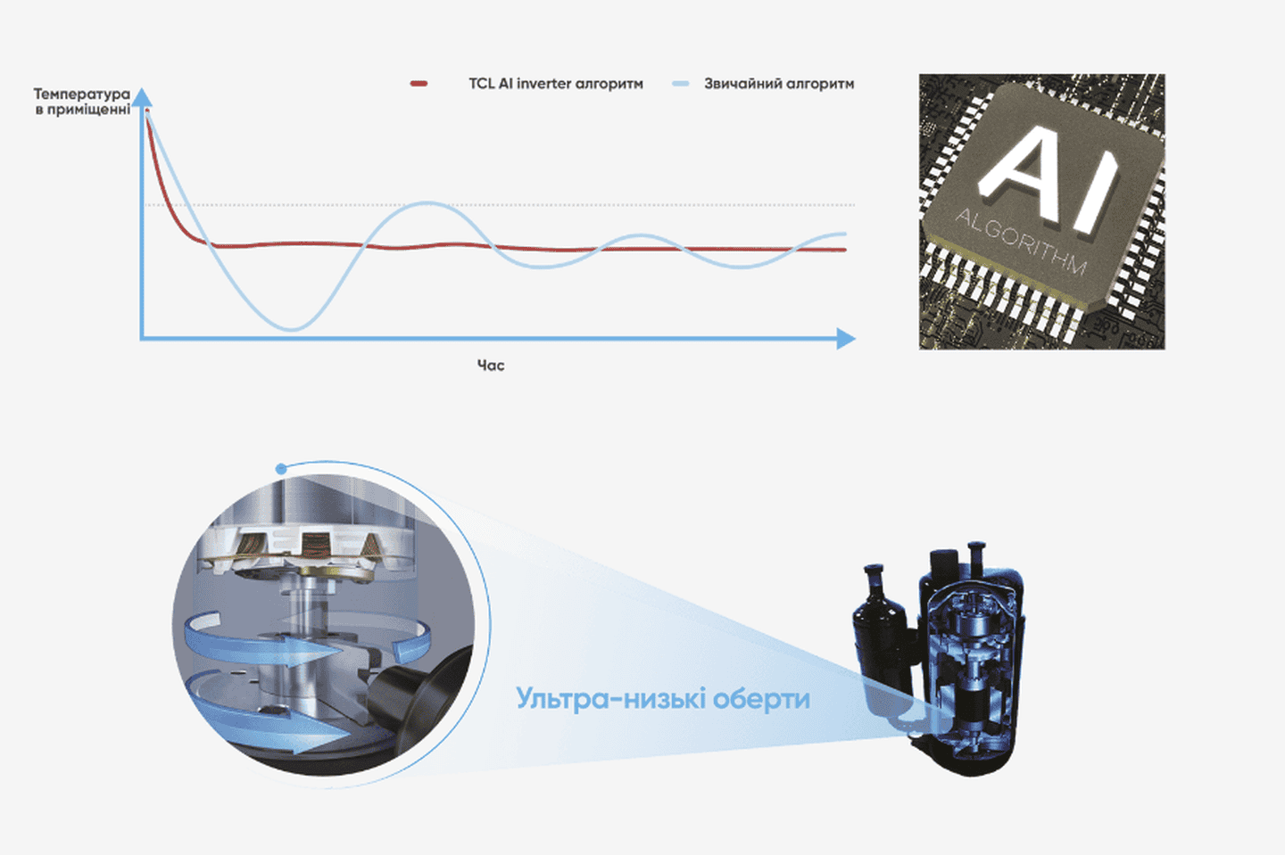Алгоритм інверторного штучного інтелекту – це передова технологія, яка дозволяє кондиціонеру працювати з максимальною ефективністю, швидко досягаючи бажаної температури та точно її підтримуючи. Інтелектуальний алгоритм оптимізує роботу компресора, регулюючи його потужність у режимі реального часу відповідно до змін температури у приміщенні. Це значно знижує енергоспоживання, оскільки кондиціонер працює лише з необхідною потужністю, не витрачаючи зайву енергію. Завдяки цьому кондиціонер стає більш економічним та екологічно безпечним, забезпечуючи комфорт у будь-яку пору року.