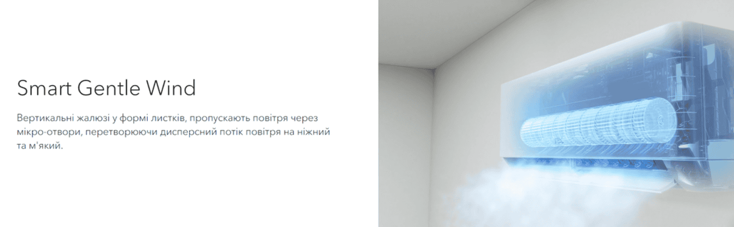 Технологія Smart Gentle Wind створює приємний і рівномірний потік повітря, що забезпечує максимальний комфорт для користувача. Особливість системи полягає в наявності мікро-отворів на жалюзі, які спрямовують потік повітря таким чином, що він не дме прямо на людину, а розсіюється більш м’яко. Це дозволяє уникнути дискомфорту від прямого впливу холодного або гарячого повітря, створюючи приємну атмосферу в кімнаті. Такий рівномірний розподіл повітря особливо підходить для спалень або дитячих кімнат, де важливий комфорт і затишок без різких змін температури.