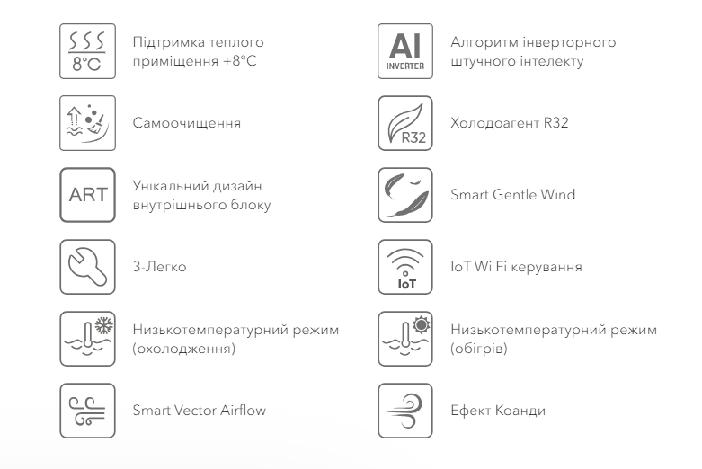 вибір режимів роботи, самоочищення, wi-fi керування, турбо режим, Smart Vector Airflow, автоматичний перезапуск, дисплей, запам'ятовування налаштувань, запуск за низьких температур зовнішнього повітря, захист будинку від обмерзання +8°C, інтелектуальне розморожування, конструкція жалюзі «ніжний вітер», нічний режим роботи, покриття теплообмінника Blue Fin, самодіагностика, старт за низької напруги, таймер 24 години, теплий старт, функція I FEEL, ефект Коанді, інтелектуальний ЕКО режим, пульт ДУ