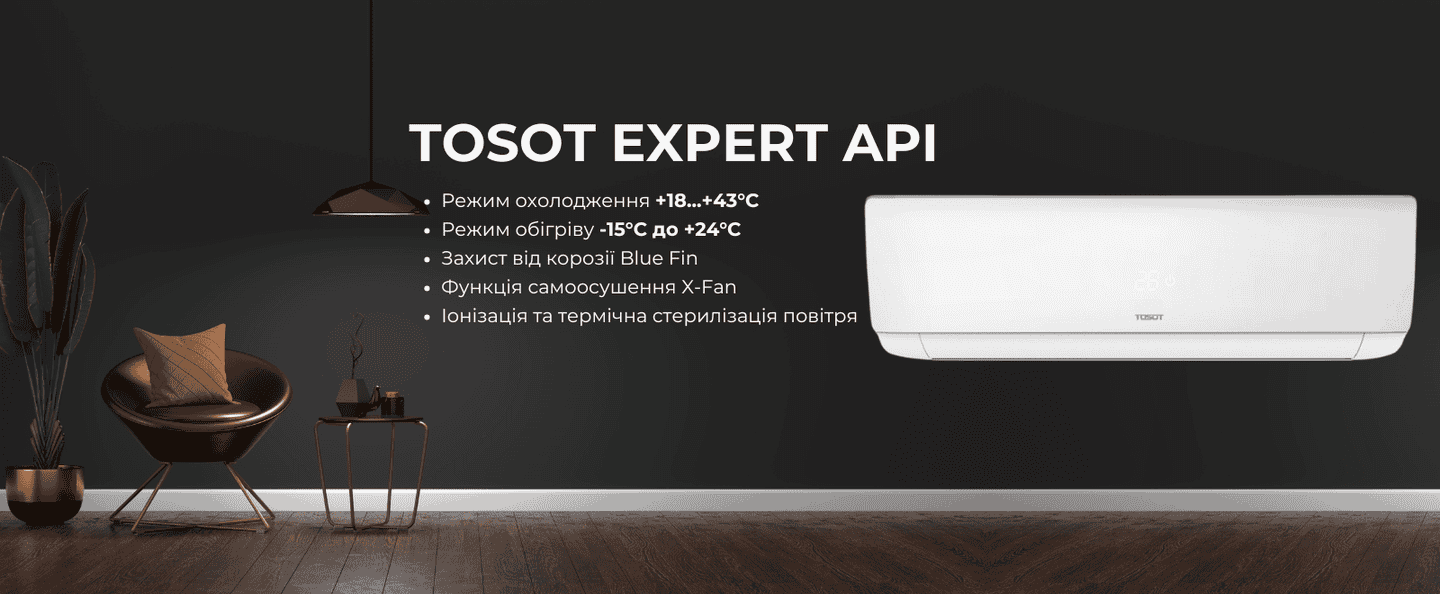 Кондиціонер TOSOT Expert API GX-12AP2, ON/OFF, 3,25 кВт, до 30-35 кв.м, робота при -15/+43°C, 220 В