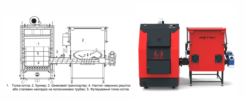 За необхідності, котел Ретра-3М Plus може бути обладнаний системою автоматичного подавання палива або щеповим бункером, що забезпечує додаткову зручність і підвищує рівень автоматизації опалювальної системи. При механізованому режимі роботи котла паливо з бункера подається в топку котла шнековим транспортером. Процес горіння відбувається на колосникових трубах. Необхідна установка на колосникових трубах настилу з чавунних решіток або сталевих