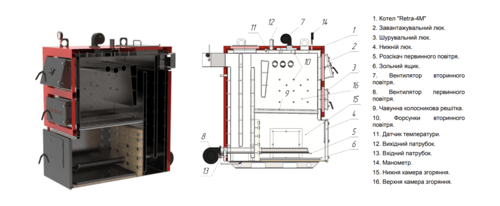 - Передні люки: Забезпечують доступ для завантаження палива, шурування та видалення золи.