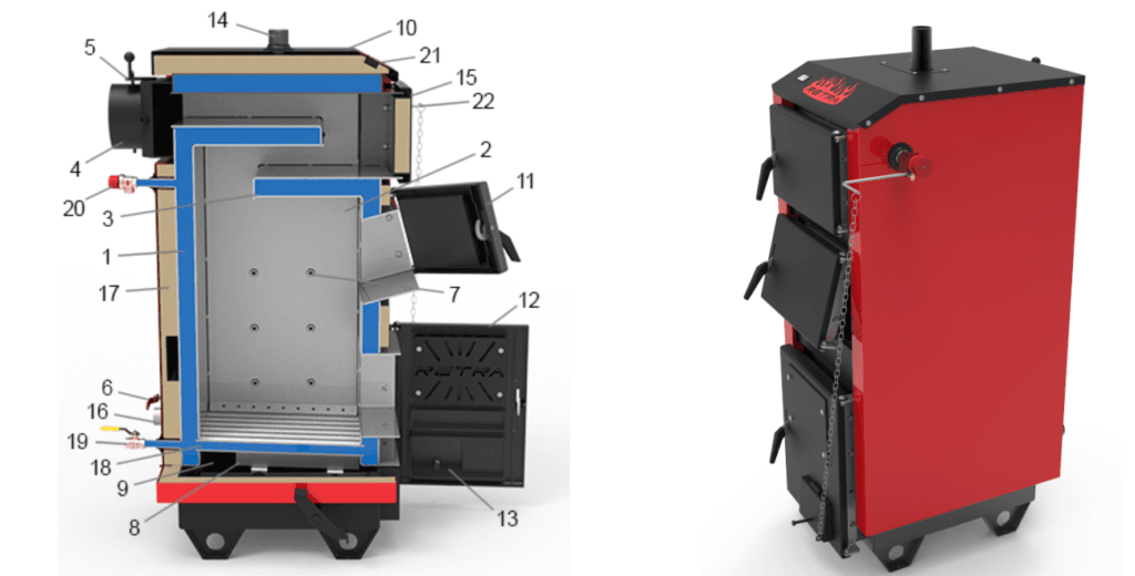 1. сталевий теплообмінник; 2. камера згоряння (топка); 3. перегородка пряма; 4. димохід; 5. шибер газоходу поворотний; 6. шибер для регулювання вторинного повітря; 7. форсунки вторинного повітря; 8. розпушувач палива; 9. камера піддувала (зольник); 10. кожух декоративний; 11. кожух декоративний; 11. люк завантажувальний; 12. люк вигрібний і видалення попелу; 13. люк піддувала; 14. патрубок подачі; 15. люк для чищення димових каналів; 16. патрубок звороту; 17. шар теплоізоляції; 18. решітка колосникова; 19. патрубок зливний з кульовим краном; 20. клапан запобіжний; 21. термометр; 22. регулятор тяги.