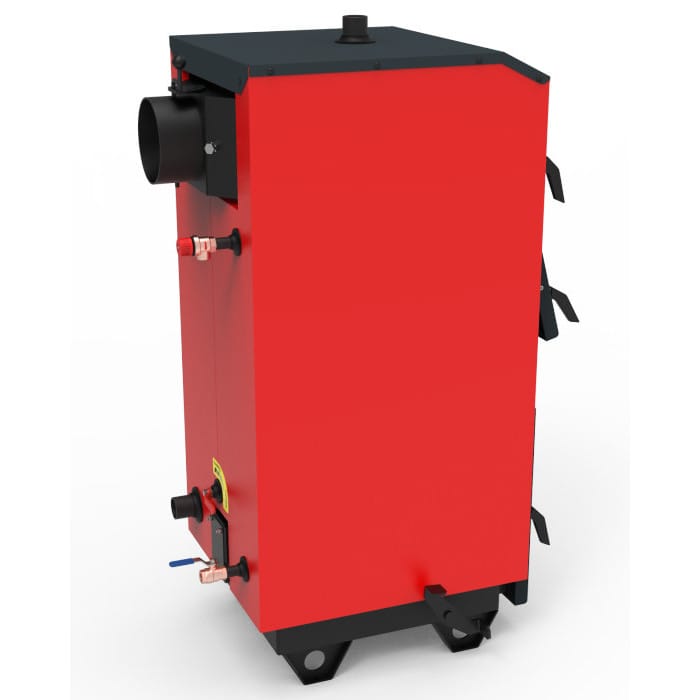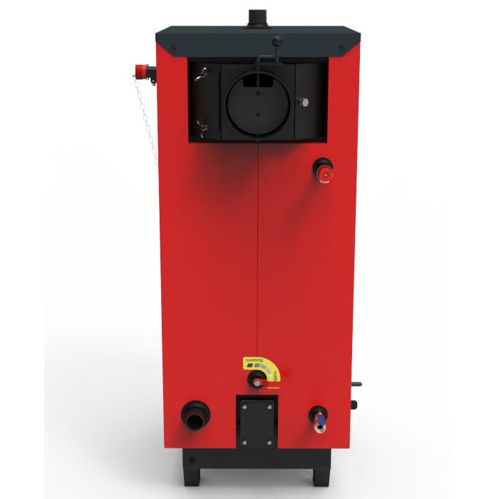 На задньому боці котла розташовано димохід із шибером газоходу поворотним, патрубки обороту і подачі, запобіжний клапан і зливний патрубок із кульовим краном. Котел обладнано декоративним кожухом із шаром теплоізоляції.