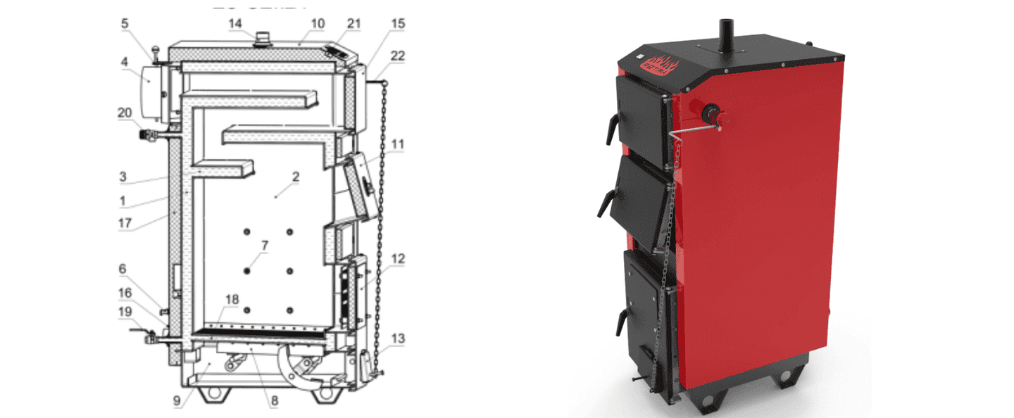 1. сталевий теплообмінник; 2. камера згоряння (топка); 3. перегородка пряма; 4. димохід; 5. шибер газоходу поворотний; 6. шибер для регулювання вторинного повітря; 7. форсунки вторинного повітря; 8. розпушувач палива; 9. камера піддувала (зольник); 10. кожух декоративний; 11. кожух декоративний; 11. люк завантажувальний; 12. люк вигрібний і видалення попелу; 13. люк піддувала; 14. патрубок подачі; 15. люк для чищення димових каналів; 16. патрубок звороту; 17. шар теплоізоляції; 18. решітка колосникова; 19. патрубок зливний з кульовим краном; 20. клапан запобіжний; 21. термометр; 22. регулятор тяги.