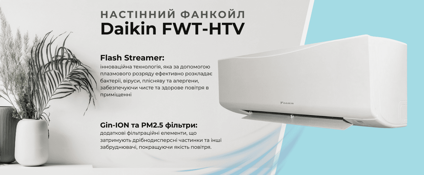 3. Настінний фанкойл Daikin FWT04HTV 3,3 кВт, 220 В, нагрівання/охолодження до 35 м², Flash Streamer