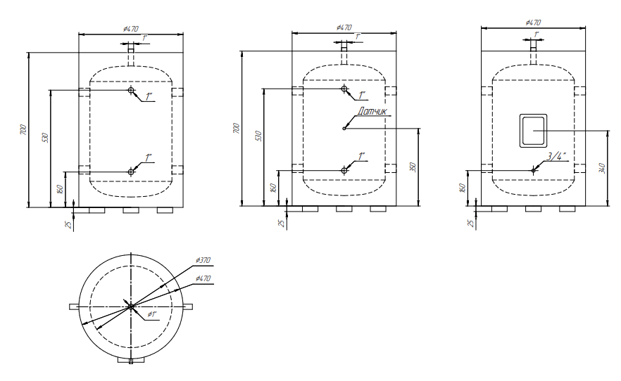 1 x g1,5» для електро-тена, закрито заглушкою; 4 x g1» для підключення обладнання; 1 x g1» зверху для групи безпеки; 1 x g3/4» для зливу рідини; 1 x g1/2″ порт датчика температури.