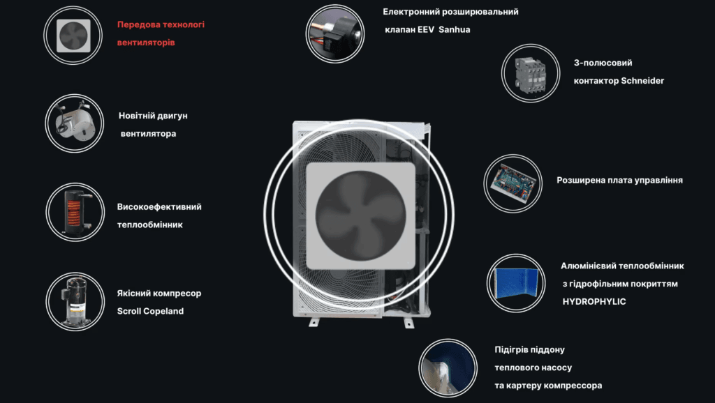 Насос використовує теплообмінник повітря-холодоагент, розташований у задній частині агрегата, як випарник. Цей компонент відіграє ключову роль у процесі обігріву.