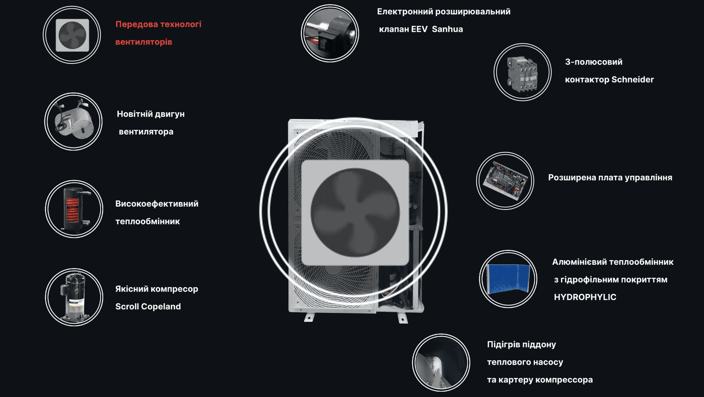 У режимі обігріву вентилятори зовнішнього блоку насоса працюють із регульованою швидкістю.