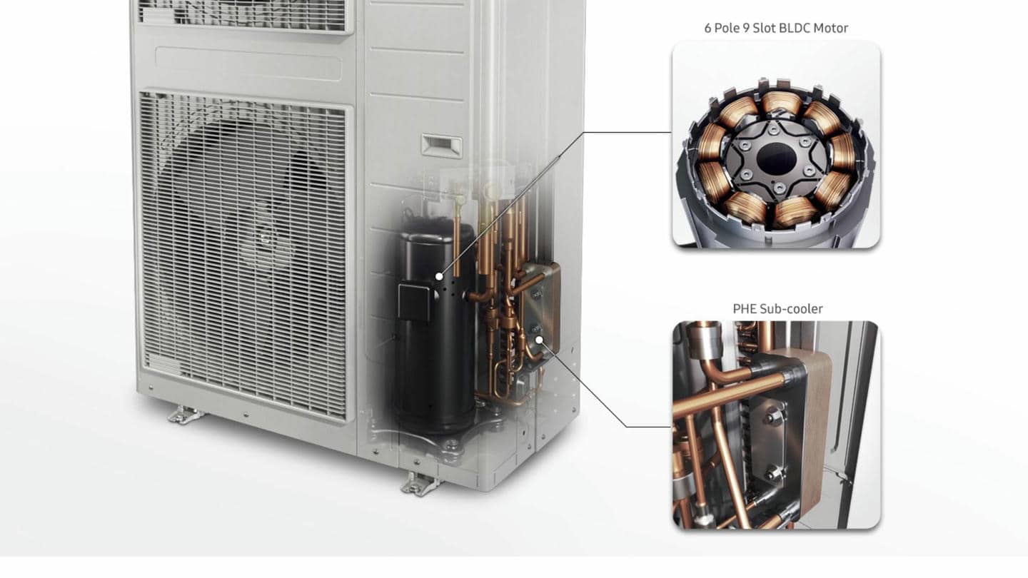 Двигун, що живить тепловий насос Samsung DVM S, є технологічним дивом, що може похвалитися вражаючим коефіцієнтом ефективності. Створений за допомогою точної техніки, він працює з рівнем звукового тиску до 58 дБа, забезпечуючи безшумну роботу, яка ідеально підходить для житлових і комерційних середовищ.