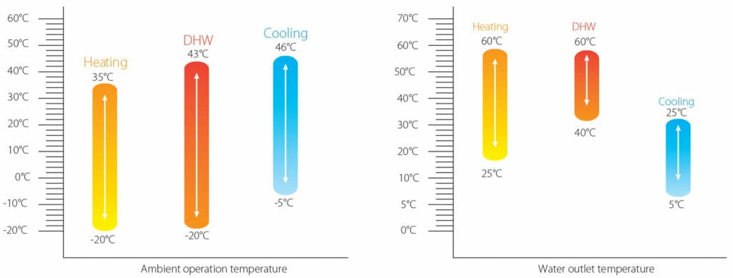 - Висока ефективність: Насос має видатну ефективність, завдяки якій ви зможете істотно знизити свої енерговитрати на обігрів і охолодження, що позитивно позначиться на ваших рахунках за енергію. Теплопродуктивність становить 80% за -7°C, завдяки збільшеному теплообміннику та компресору великої потужності. Сумісний з різними додатковими джерелами тепла, включно з сонячними водонагрівачами та бойлерами.