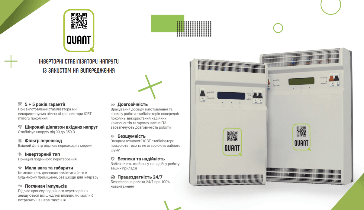 Стабілізатор QUANT є надійним рішенням для забезпечення стабільного електроживлення, запобігаючи пошкодженням електроніки та забезпечуючи безперебійну роботу підключених пристроїв.